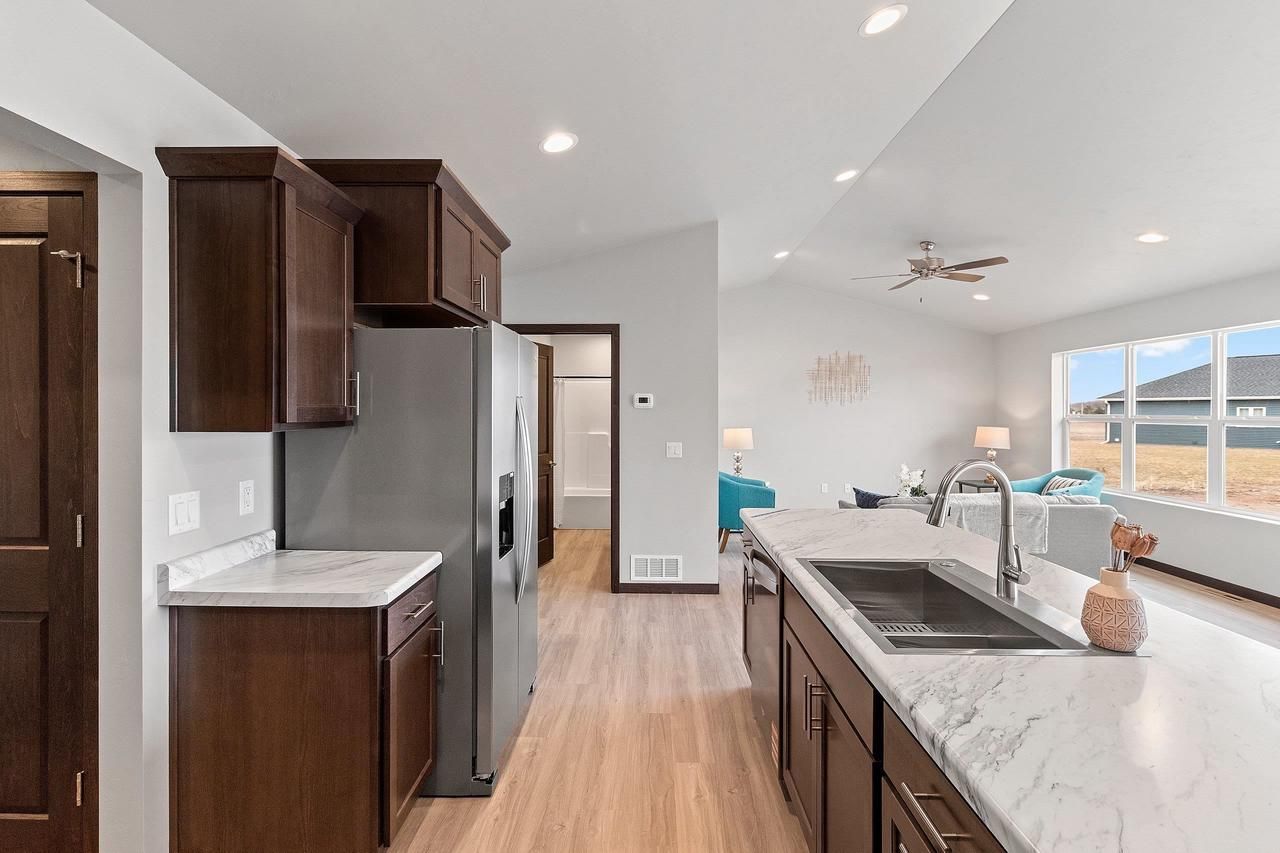 Welcome home from Tom McHugh Construction! This home is move in ready and features a 1288 sqft floor plan from our Palm collection. This 2 bedroom home is the zero entry from all access points plus 36" wide interior doors for easier access. Standard features include LVP throughout the main living areas, insulated garage doors, fiberglass exterior doors, 2 panel interior doors, 1 egress window, central AC, basement stubbed for a future bath. Full driveway to street included (including apron), final streets are already installed. 2 bedrooms, Zero entry living, and NO HOA fees!