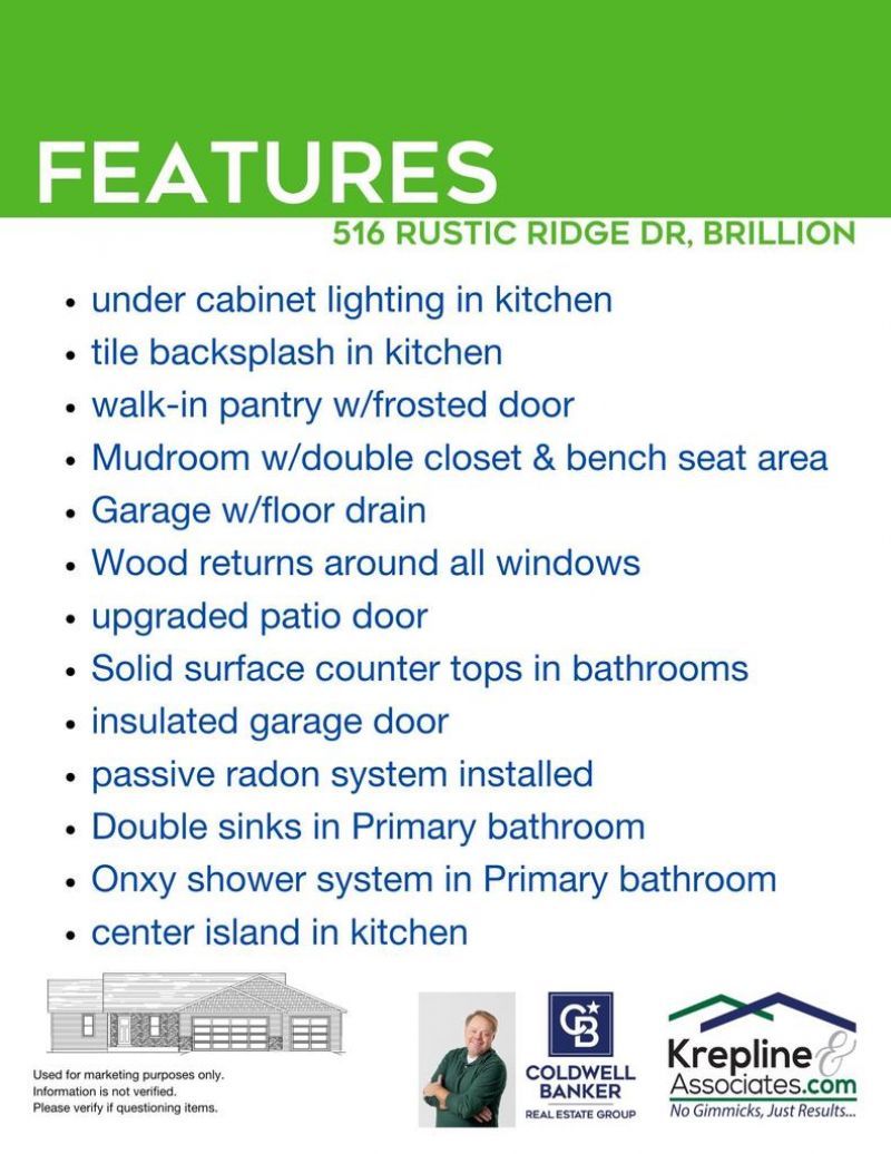 NEW HOME to be done by July 2026! Stunning split bedroom ranch in Maple Ridge, a premier subdivision in Brillion & on the edge of town! Over 1554 SF on main floor boasts a great open concept & storage everywhere. Vaulted ceiling in great rm opens to a Kitchen w/8' center island, endless counter, undercabinet lighting, tile backsplash & cabinetry w/slow close drawers & doors PLUS a walk-in pantry! MY FAV...Sun drenched dining area w/windows galore & patio doors to the backyard. 1st-floor laundry rm w/bench seat & double closet. 1st-floor primary suite has an extra window, walk-in closet, double sinks & Onxy walk-in shower! Solid surface countertops in bathrooms, 3 panel solid doors, passive radon, garage floor drain & much more. Curb/gutter/street done. Pics of similar home completed