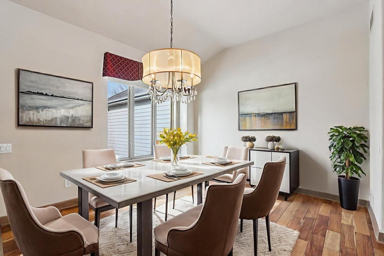 Custom split ranch offering 10ft ceilings. Hand Scraped Asian Walnut flooring throughout main living area, six panel doors, updated lighting fixtures, Hunter Douglas window treatments, room darkening in primary. Skip trowel plaster in main living area. Kitchen w/breakfast bar updated with quartz tops, glass tile backsplash, Viking range, Miele dishwasher, additional cabinets w/drawers were added. All closets in home are custom by All About Organization. Primary w/bay window, DBL vanity, soak tub, walk in shower. Lower level includes wonderful additional living area with Polk Audio speaker system, spacious storage area's wall of shelving. 600 SQ FT Heated garage! Patio concrete 3 yrs and driveway 8 yrs. Some photos digitally altered/staged.