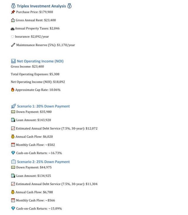 High-yield triplex generating $23,400 in gross annual rents with approximately a 10% cap rate at the current list price. Tenants pay all utilities, keeping owner expenses low. Annual expenses include property taxes, insurance, and maintenance reserve, resulting in an estimated NOI of $18,000+. SEE ASSOCIATED DOCS FOR INVESTMENT ANALYSIS. Three 1-bedroom units with off-street parking. Appliances included. One unit has forced air heat; two have radiant heat. Simple, efficient, income-producing asset with strong day-one returns. Brand new roof, siding, gutters & downspouts.