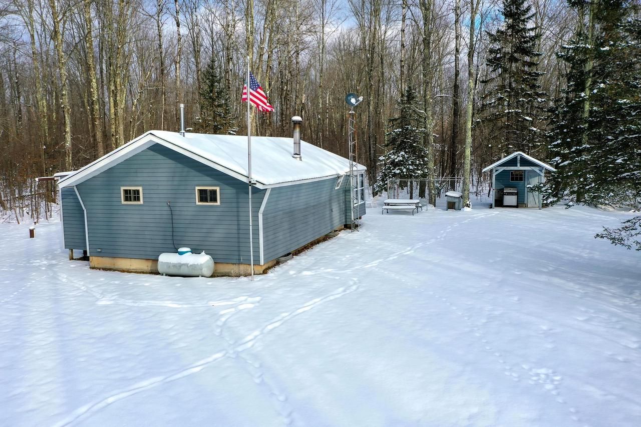 Furnished hunting cabin with a direct border on the Nicolet-Chequamegon National Forest. Located at the end of a dead-end road with gated driveway. Mature hardwoods and trail system leading through the +/-3.66 acres. Large yard with campfire pit and wood fired sauna. Great room with wood burning fireplace. Open concept kitchen with access to covered porch. Two-bedroom areas. Indoor shower room. Forced air lp furnace. Drilled well and electricity. 16x8 storage shed. Privy with electricity. Maintenance free vinyl siding and metal roof. Located on the utv/atv route and close to Jump River and Mondeaux Flowage. The refrigerator, range, dryer, wood stove, storage shed, window ac unit, tv, dog kennel, grill and cabin furnishings are included in the sale price.